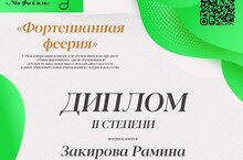 По результатам конкурса, в номинации «Соло. 1 группа: 1 – 2 год обучения по предмету «Общее фортепиано», учащаяся нашей школы, Закирова Рамина (преподаватель – Казакова И.А.) награждена дипломом II степени.