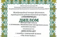 6 октября 2018 года в Казанском государственном институте культуры состоялся Международный конкурс-фестиваль традиционной художественной культуры «Этномириада».По итогам конкурса-фестиваля в номинации «Национальное инструментальное исполнительство» дипломантом стал ансамбль этнической музыки “The Irish Snake”, в составе которого выступили преподаватели ДМШ №7 им.З.В.Хабибуллина: Галимуллин Р.И., Кручинина Ю.В., Сухомяткин К.В. и Хабибулин Р.Н.Поздравляем!