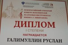 С 23 по 25 апреля 2018 г. в г.Саратов на базе Саратовской государственной консерватории им.Л.В.Собинова проходил III Всероссийский открытый конкурс исполнителей на духовых инструментах имени А.Г.Никитанова.По результатам конкурса Дипломом I степени награждён преподаватель ДМШ №7 им.З.В.Хабибуллина Галимуллин Р.И.Наши поздравления!!! -