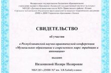 Преподаватель нашей школы, Низамиева Н.Н., выступила на мероприятии с докладом на тему: «Развитие музыкальных способностей у обучающихся средствами музыкального фольклора» и получила соответствующее свидетельство.