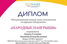 По результатам конкурса, в номинации «Домра. Соло. Группа 1», учащаяся нашей школы, Хакимова Резеда (преподаватель – Зыкова С.Ю.) – Лауреат II степени.