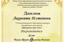- ансамбль кураистов «Чишмэкэй» (преподаватель – Низамиева Н.Н.) – Дипломант I степени.