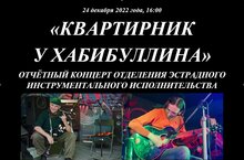 24 декабря 2022 года в ДМШ №7 им.З.В.Хабибуллина состоялось традиционное открытое мероприятие «КВАРТИРНИК У ХАБИБУЛЛИНА», в котором приняли участие учащиеся отделения эстрадного инструментального исполнительства (преподаватели – Хабибулин Р.Н., Закиров А.А., Галимуллин Р.И.).