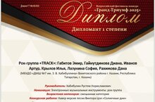 - в номинации «Электронные музыкальные инструменты», рок-группа «Track» (художественные руководители – Хабибулин Р.Н., Закиров А.А.; учащиеся – Габитов Эмир, Гайнутдинова Диана, Иванов Артур, Крылов Илья, Лазунина София, Рахимова Дана) – Дипломант I степени;