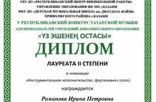 - в номинации «Общее фортепиано. 10 – 12 лет. Соло», Салахова Алиса (преподаватель – Закирова А.А.) – Лауреат II степени;