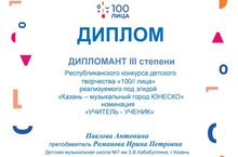 По результатам конкурса, в номинации «Учитель – ученик», учащаяся нашей школы, Павлова Антонина и её преподаватель, Романова И.П. – Дипломанты III степени.