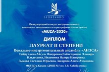 12 апреля 2020 года в Казани состоялся заочный Международный конкурс инструментального, вокального, театрального и хореографического искусства «MUZA – 2020», в котором приняли участие учащиеся и преподаватели нашей школы.По результатам конкурса:- в номинации «Общее фортепиано. Средняя группа», Салахова Алиса (преподаватель – Закирова А.А.) – Лауреат II степени;- вокально-инструментальный ансамбль «АНЭСА» (преподаватели: Гайнетдинова Э.И., Закирова А.А., Зыкова С.Ю., Низамиева Н.Н., Сайфуллина А.Ф.) – Лауреат II степени.ПОЗДРАВЛЯЕМ НАШИХ ЛАУРЕАТОВ И ЖЕЛАЕМ ИМ ДАЛЬНЕЙШИХ ТВОРЧЕСКИХ УСПЕХОВ!!! -