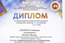 Поздравляем Хамзину Милану и ее преподавателя Гизатуллину Камилю Лемаровну с двойным лауреатством в XII Международном фестивале-конкурсе детского и юношеского творчества " Содружество талантов".