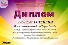 Поздравляем вокальный ансамбль " Супер Детки" ( учащиеся 3 класса) и их руководителя Гизатуллину К.Л. с победами в I Международном конкурсе-фестивале " ДоРеМИКС"!