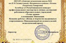Педагогический коллектив ДМШ № 26 им. В.М. Гизатуллиной одержал победу в I Республиканском конкурсе профессионального мастерства и личных достижений работников образовательных учреждений " Точка зрения" в номинации : Инновации ( инновационный исследовательский педагогический проект " Жизнь и творчество выдающихся современников")