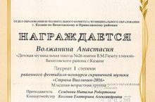 13 марта 2016 года юные скрипачи из ДМШ №26 приняли участие в районном фестивале-конкурсе скрипичной музыки "Страна Виолиния - 2016". Учащиеся класса Натальи Робертовны Семёновой завовевали два 1 места: Анастасия Саламахина (2 класс), Варвара Парамонова (4 класс); Илья Кузнецов (7 класс) стал обладателем Диплома лауреата 3 степени, Анастасия Саламахина (3 класс) награждена Дипломом дипломанта 1 степени! Дипломом "Лучший концертмейстер" награждена Екатерина Александровна Козлова.