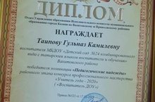 Наш воспитатель 1 категории Таипова Гульназ Камилевна участвовала в конкурсе профессионального мастерства "Воспитатель года" и стала победителем в районном этапе в номинации "Педагогические надежды". Поздравляем ее с этой победой, желаем творческих успехов и больших достижений в будущем!
