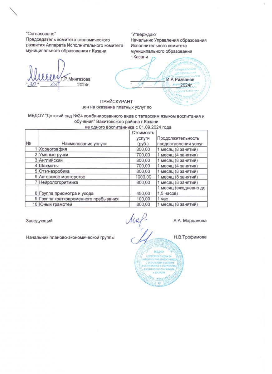 Прейскурант цен на оказание платных образовательных услуг за 2024 г