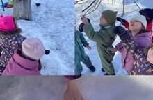 Дети старшей группы любят наблюдать во время прогулки. Нашли следы птичек, почки стали еще крупнее. Даже голубь не сбежал. Голубое чистое небо выше, чем зимные серые облака.