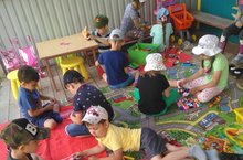 Очень интересно летом в детском саду. Можно побегать, попрыгать, делать куличики, а если солнышко становится очень активным, можно и на прохладной веранде поиграть.