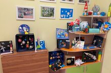 В саду работает выставка "Удивительный космос". Как всегда, работы на выставке отличаются своим разнообразием и красотой.