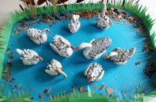 Дошкольное детство конечно же подразумевает игровую деятельность, но на ряду с играми, танцами, песнями, сказками есть еще образовательная деятельность наших воспитанников. Где они учатся лепить, рисовать, конструировать, вырезать и т.д. Наши воспитатели в своей работе стараются использовать еще и нетрадиционные методы работы с детьми. Одной из таких работ является коллективная работа наших воспитанников с воспитателем в подготовительной группе "Лебедтное озеро". Ребята с помощью природного материала и пластилина смастерила такую красоту.