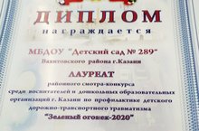 Наш детский сад был отмечен дипломом лаурета на районном этапе смотра-конкурса среди дошкольных образовательных организаций г. Казани по профилактике детского дорожно-транпортного травматизма "Зеленый огонек - 2020"!