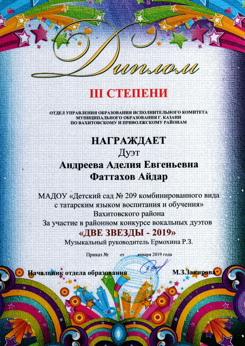 Бакчабызда тәрбияләнүче Фаттахов Айдар һәм өстәмә эш җитәкчесе Андреева А.Е. "Ике йолдыз" бәйгесендә катнашып өченче дәрәҗә дипломга лаек булдылар.