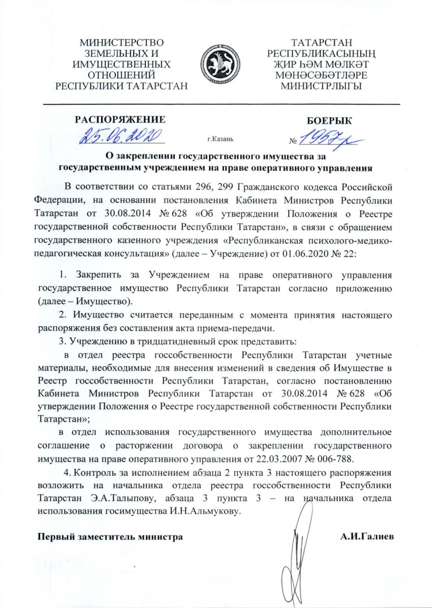 - Распоряжение о закрепление Государственного имущества за государственным учреждением.