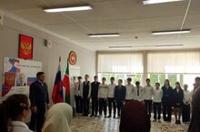Cегодня прошла еженедельная церемония поднятия флагов и исполнения гимнов РФ и РТ. На церемонии присутствовали 8 классы.