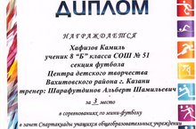Поздравляем Хафизова Камиля, ученика 8 класса, занявшего 3 место в соревнованиях по мини-футболу в зачет Спартакиады учащихся общеобразовательных учреждений г. Казани (тренер Шарафутдинов А.Ш.)