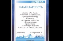За участие в проекте " Школа успеха" получена благодарность от газеты "Pro город" (директор Клабукова Е.В.)