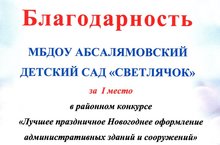 МБДОУ "Абсалямовский детский сад "Светлячок" занял 1 место в районном конкурсе "Лучшее праздничное Новогоднее оформление административных зданий и сооружений" среди бюджетных учреждений сельской местности Ютазинского муниципального района Республики Татарстан 2016 год