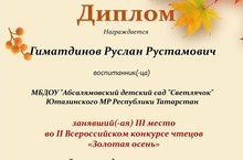 Воспитанник старшей группы Гиматдинов Руслан участвовал во II Всероссийском конкурсе чтецов "Золотая осень".Занял 3 место.Поздравляем!