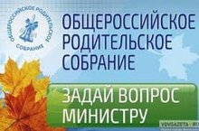 29 августа 2018 года состоится Общероссийское родительское собрание в формате видеоконференции с участием Министра просвещения Российской Федерации О.Ю.Васильевой. Направить вопрос Министру просвещения Российской Федерации О.Ю.Васильевой можно через электронную форму веб-страницы собрания на официальном сайте Министерства просвещения Российской Федерации: http://edu.gov.ru/opc-view.