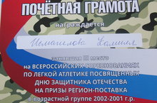 На Всероссийских соревнованиях по легкой атлетике, посвященных Дню Защитника Отечества, на призы «Регион-Поставка» в возрастной группе 2002-2001 г.р. на дистанции 150 м Исмагилова Камиля – ученица 9 класса – активистка РДШ - заняла 3 место. Соревнования прошли 22 февраля. Поздравляем!