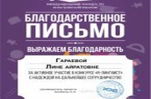 В марте месяце обучающиеся нашей школы Бекбулатов Энвер (5кл), Исмагилова Камиля и Хасаншина Диана (7кл) приняли участие в Международном конкурсе по иностранным языкам "Я-лингвист". Ребята показали хороший уровень знаний и были награждены Сертификатами участника, руководитель - учитель английского языка Гараева Л.А. - благодарственным письмом. Поздравляем!