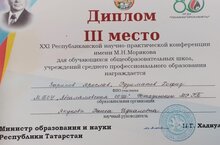 Ученики 5 класса Зарипов Ярослав и 7 класса Рузиматов Хофиз приняли участие в XXI Республиканской НПК им.Морякова в г.Лениногорский и заняли 3 место. Руководитель Якупова Р.И.