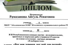Поздравляем Рамазанову Айгуль Ренатовну с победой в Репсубликанском конкурсе научно-исследовательских, проектных и творческих работ учащихся 4-9 классов на основе естественно-научных дисциплин "Я выбираю село".