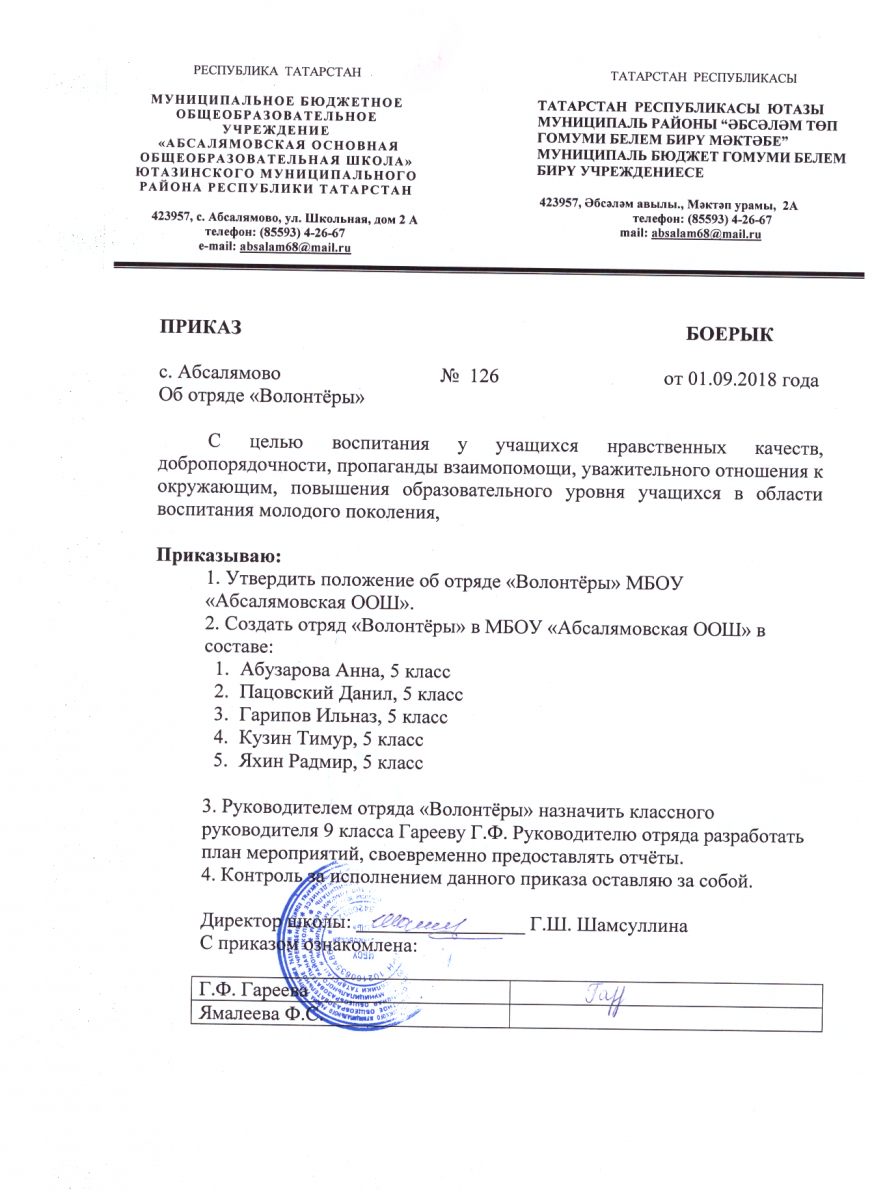 Приказ о создании отряда "Волонтёры" на 2018-2019 учебный год