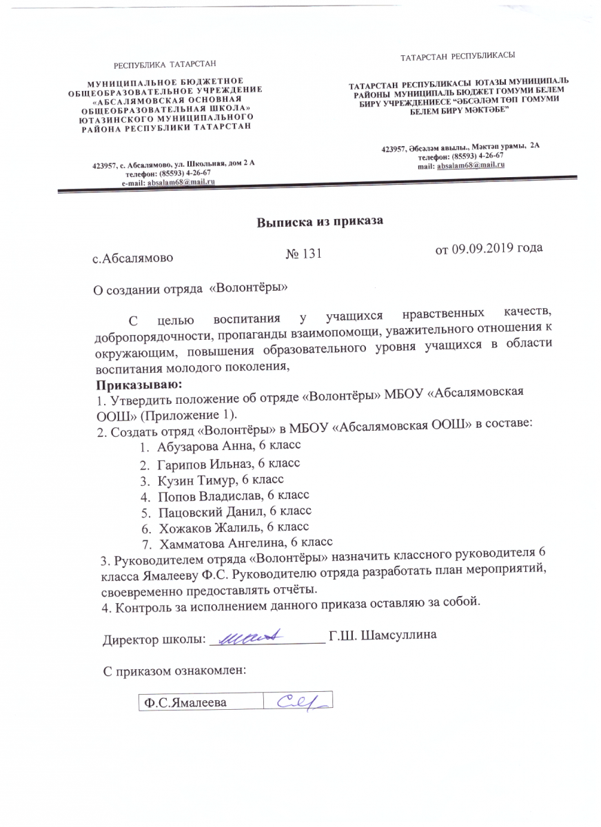 Приказ о создании отряда "Волонтёры" на 2019-2020 учебный год