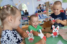 Дети любят заниматься творчеством. На этот раз ребята выполнили аппликацию под названием "Зайка".
