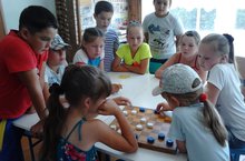 Сегодня мы учились составлять букеты из цветов. Смотрели презентацию, а затем сами пытались составить букет. У детей получились очень интересные композиции. Потом играли в игру «Путешествие на поезде дружбы». По команде машиниста, все «пассажиры сели в вагончики» и отправились в веселое путешествие по станциям. На первой станции: «Поиграй-ка!» ребята играли в подвижные игры разных народов. Вторая станция называлась: «Стихи и загадки». Ребята сами по очереди находили и загадывали загадки, читали стихи. Путешествие завершилось на станции: «Спортивная». На этой станции отряд поделился на две команды и приняла участи в спортивной эстафете: «Кто быстрее?». Обе команды оказались ловкими и быстрыми. Всем очень понравилось путешествие по станциям. После обеда провели шашечный турнир.