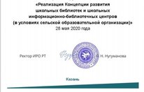28 мая 2020 года библиотекарь Гибадуллина Г.Н. приняла участие в работе круглого стола "Реализация Концепции развития школьных библиотек и школьных информационно-методических центров (в условиях сельской образовательной организации", организованного ИРО РТ