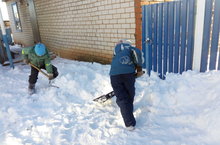 Учащиеся 1 и 4 класс после очередного снегопада помогами учителю-ветерану Инсаповой Х.М. очистить двор от снега.