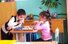 Учащиеся 1 класса после уроков учатся играть в шашки.