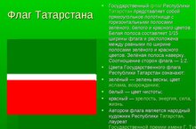 Татарстан Республикасының Дәүләт флагы Татарстан Совет Социалистик Республикасы Югары Советы тарафыннан 1991 елнын 29 ноябрендә кабул ителде. Ул — яшел, ак, кызыл төстәге тасмалардан торган тукыма. Яшел тасма — өстә, кызылы — аста, алар арасында — флаг иңенец 1/15 тәшкил иткән кинлектәге ак тасма. Бертигез яшел һәм кызыл тасмалар һәрберсе флаг иңенең 1/7 тәшкил итәләр. Флагның иңенә буе — 1:2.