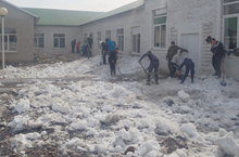 Бүген укучылар мәктәп һәм мәктәп яны территориясен җыештырдылар, кар тараттылар.
