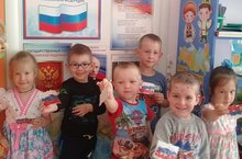 В канун празднования Дня России были проведены с детьми беседы "Наша Родина-Россия", знакомили с государственной символикой, а также дети проявили художественное творчество "Российский флаг" (аппликация)-закрепили прием обрывной аппликации.