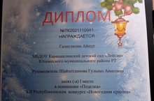 Диплом.Галиуллин Айнур занял 1 место в номинации "Поделка" в II Республиконском конкурсе "Новогодняя красота"