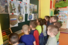Балалар белән "Кемнәр алар ил сакчылары?"дигән темага әңгәмә үткәрдек. Ил сакчыларының рәсемнәрен, символларын, киемнәрен карадык.