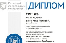 Ученик 9 класса Валеев А.Р. принял участие в IV Всероссийской научной конференции-конкурсе учащихся имени Льва Толстого (секция «Информационные технологии в филологии и образовании») и был награждён дипломом (научный руководитель: Карамова Г.М.).
