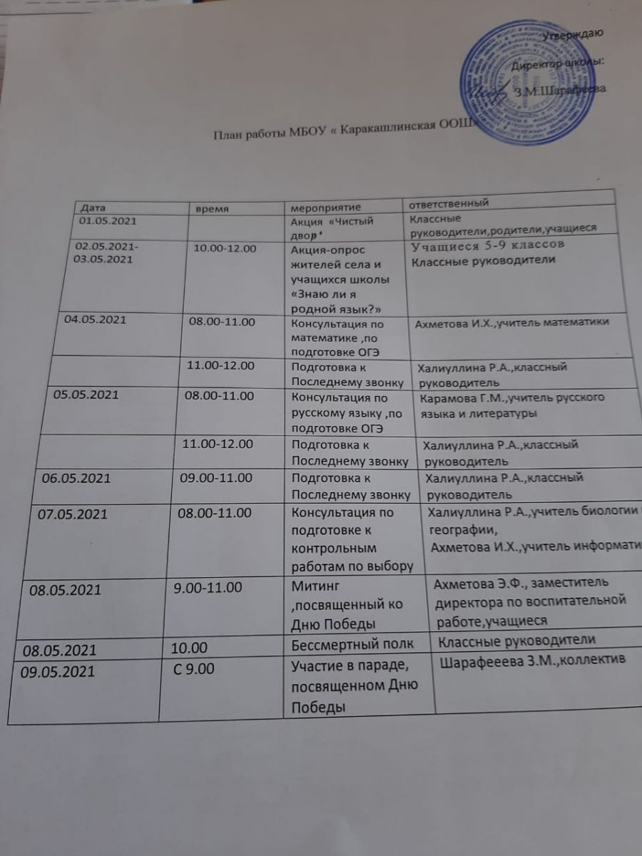 План работы МБОУ “Каракашлинская ООШ” с 1.05 по 9.05 01.05.2021