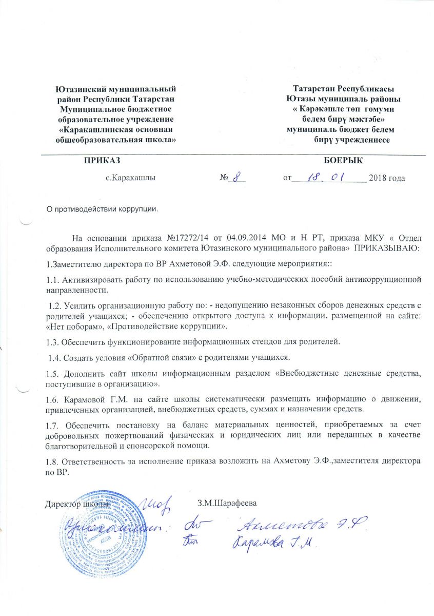 Приказ №8 от 18.01.2018г. О противодействии коррупции