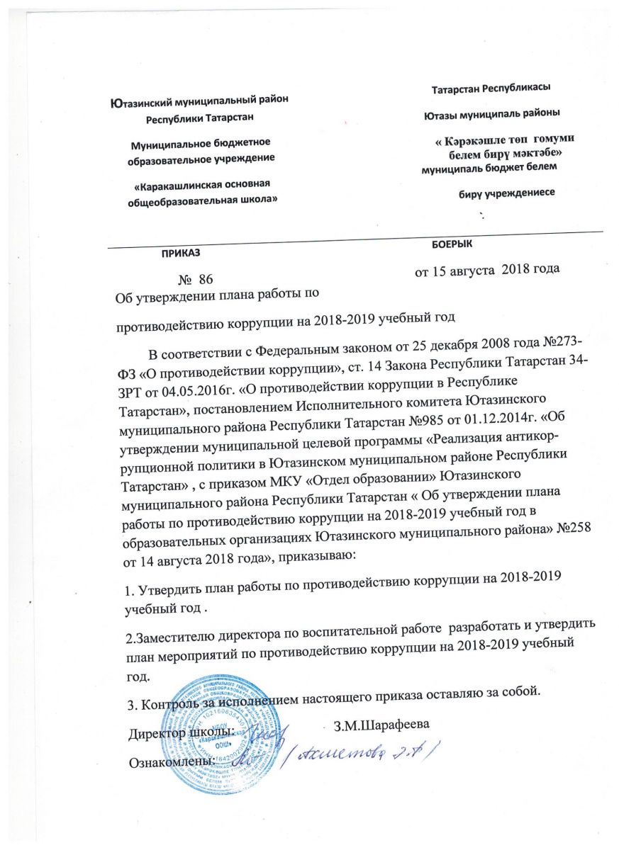 Приказ по школе об утверждении плана работы по противодействию коррупции на 2018-2019 учебный год